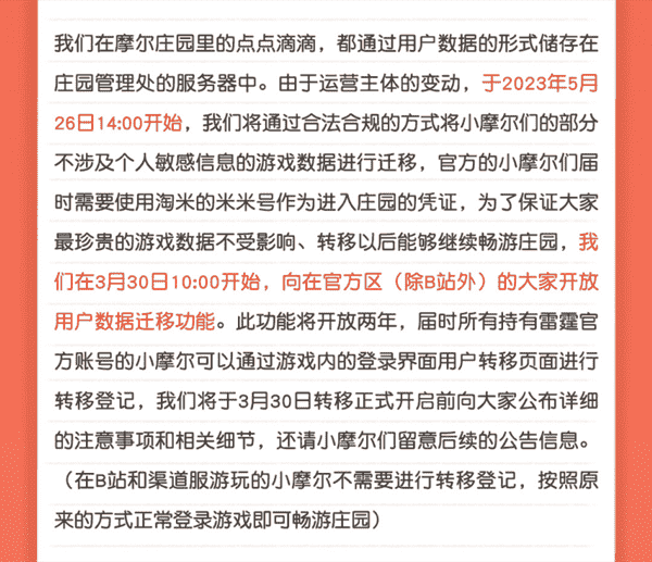 合作结束本就是开发方和代理方双方的事情,,降低这件事情对玩家的影响,,才是对所有珍视这段童年的摩尔玩家最好的呵护。。。。目前看来,,,,用户完全不用担心后续因无法登录游戏而造成任何数据上的损失,,,只要及时进行账号转移,,,就可以好好保留、、、、延续在庄园的痕迹和回忆,,,继续在庄园里做快乐的红鼻子小鼹鼠。。。