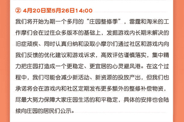 合作的结束并不意味着这个童年IP的结束,,,,对于《摩尔庄园》手游而言,,这是一个新阶段的开始。。后续游戏内将开启庄园重构计划,,会就以往遗留下来的BUG进行集中修复,,,并在游戏内和社区定期发布更多补偿物资。。