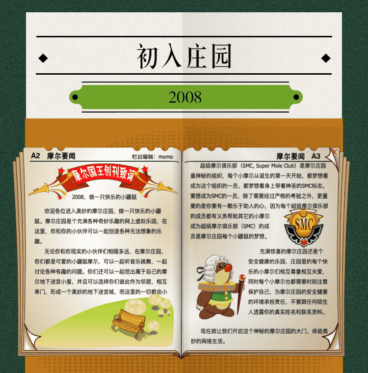 在这一年,,摩尔庄园诞生了。。。在这里,,,,大家都是可爱的红鼻子鼹鼠小摩尔,,,,可以一起勤劳耕作,,,,一起高山滑雪......我们都是摩尔庄园的建设者。。。