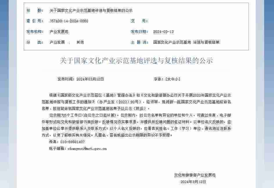 新一批国家文化产业示范基地公示,,,亚星管理成功入围